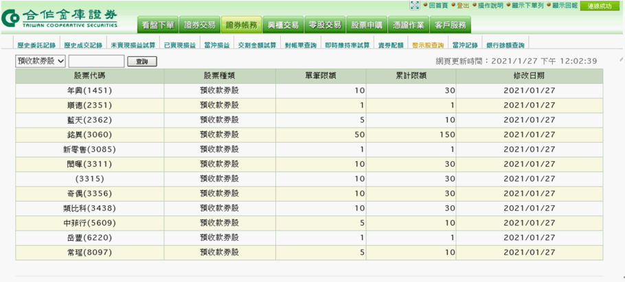點選系統的〔證券帳務〕按鈕,再點選〔警示股查詢〕標籤。