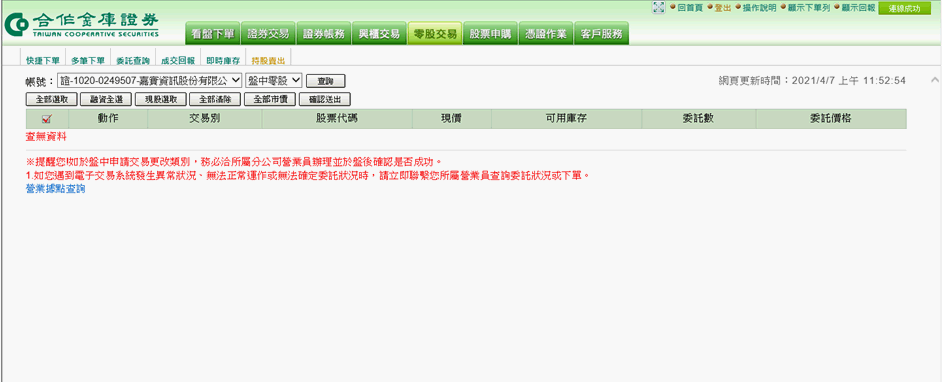 )按鈕,可以單筆委託的方式賣出庫存部位。