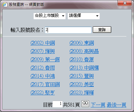 點選〔查股號〕按鈕會依所選市場彈出該市場的「股號查詢」小視窗,可以在小視窗選擇類股,再選取想要交易的股票,系統會把所點選的股票代碼帶到 下單介面的「輸入欄」內; 也可以在「輸入股號股名」欄輸入「股票名稱」或「股票代碼」,按下〔查詢〕按鈕,搜尋出所輸入的「股票名稱」及「股票代碼」。