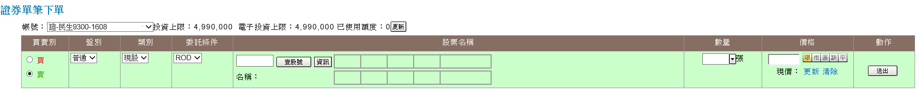 )四個按鈕,提供以滑鼠左鍵選取委託價格的服務,點選「限」預設帶目前成交價到「價格」輸入欄,點選「市」預設帶目前市價到「價格」輸入欄,點選「漲」帶漲停到「價格」輸入欄,點選「跌」帶跌停到「價格」輸入欄;(
