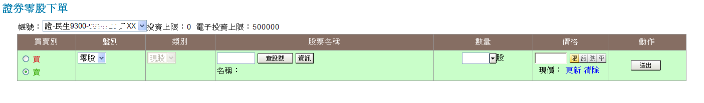 )四個按鈕,提供以滑鼠左鍵選取委託價格的服務,點選「現」預設帶目前成交價到「價格」輸入欄,點選「漲」帶漲停到「價格」輸入欄,點選「跌」帶跌停到「價格」輸入欄;(