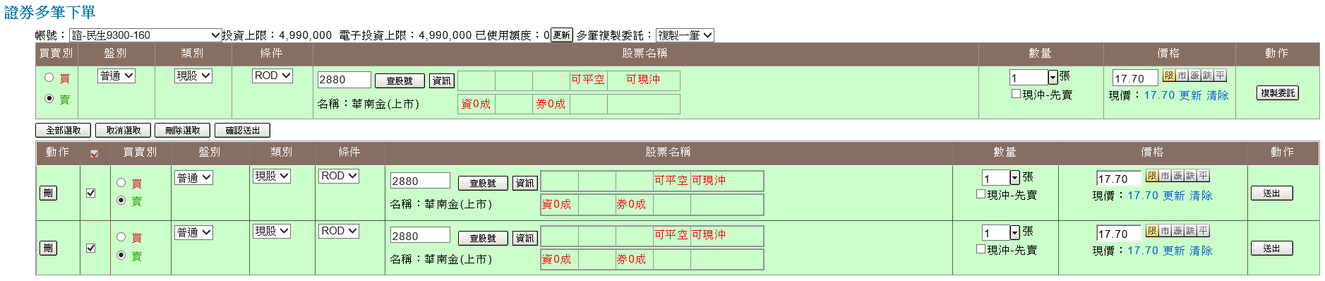 點選系統的〔證券下單〕按鈕,再點選〔多筆下單〕標籤。