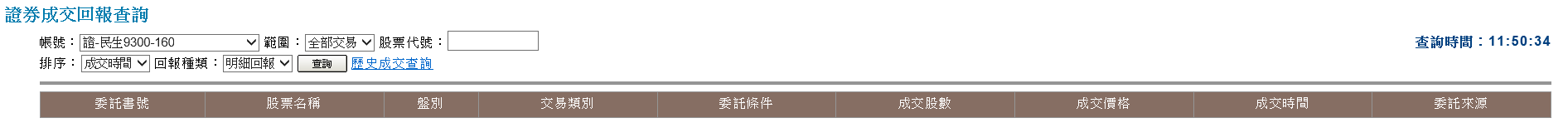 )由下拉式選單選擇查詢 「成交時間」、「委託書號」、「股票代碼」。