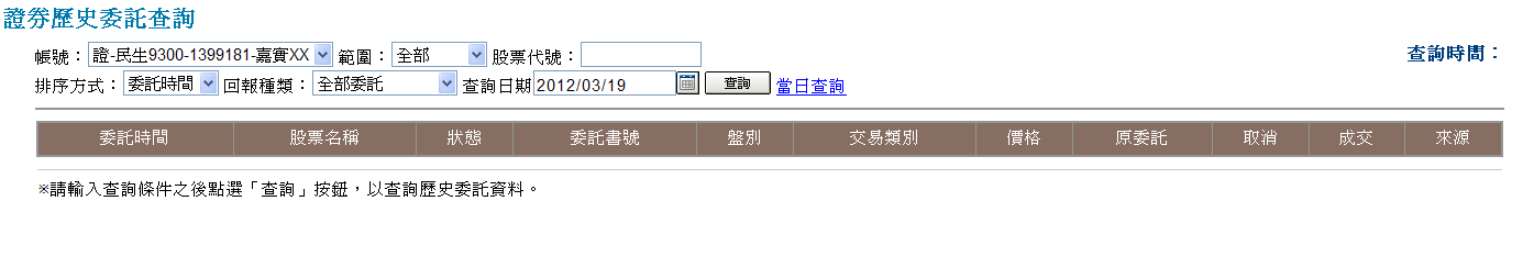 點選系統的〔證券帳務〕按鈕,再點選〔歷史委託查詢〕按鈕。