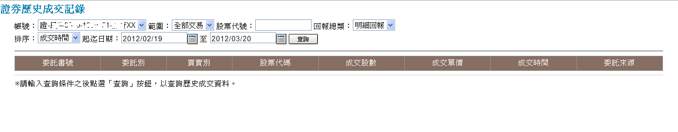 點選系統的〔證券帳務〕按鈕,再點選〔歷史成交查詢〕標籤。