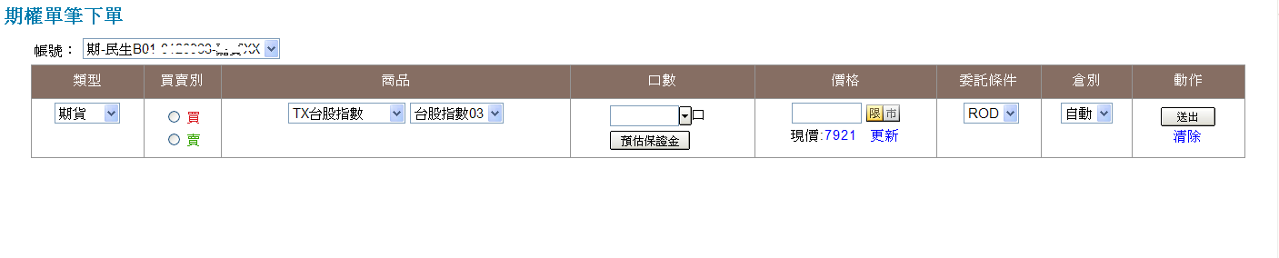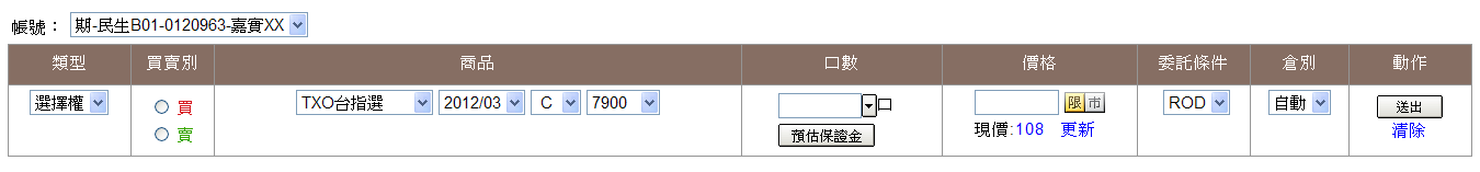 選擇權下單列: