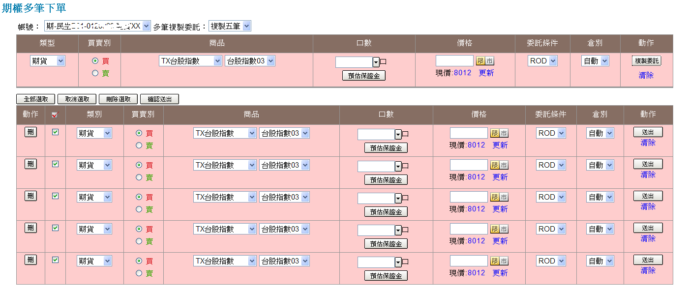 在「動作」欄位選擇( )按鈕,可將下單列內委託資料依照所選之複製筆數複製於下方工作表內。