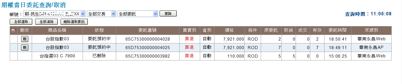 「全部委託」、「委託失敗查詢」、「完全成交委託」、「未完全成交委託」、「可刪單(含預約單)」。 |