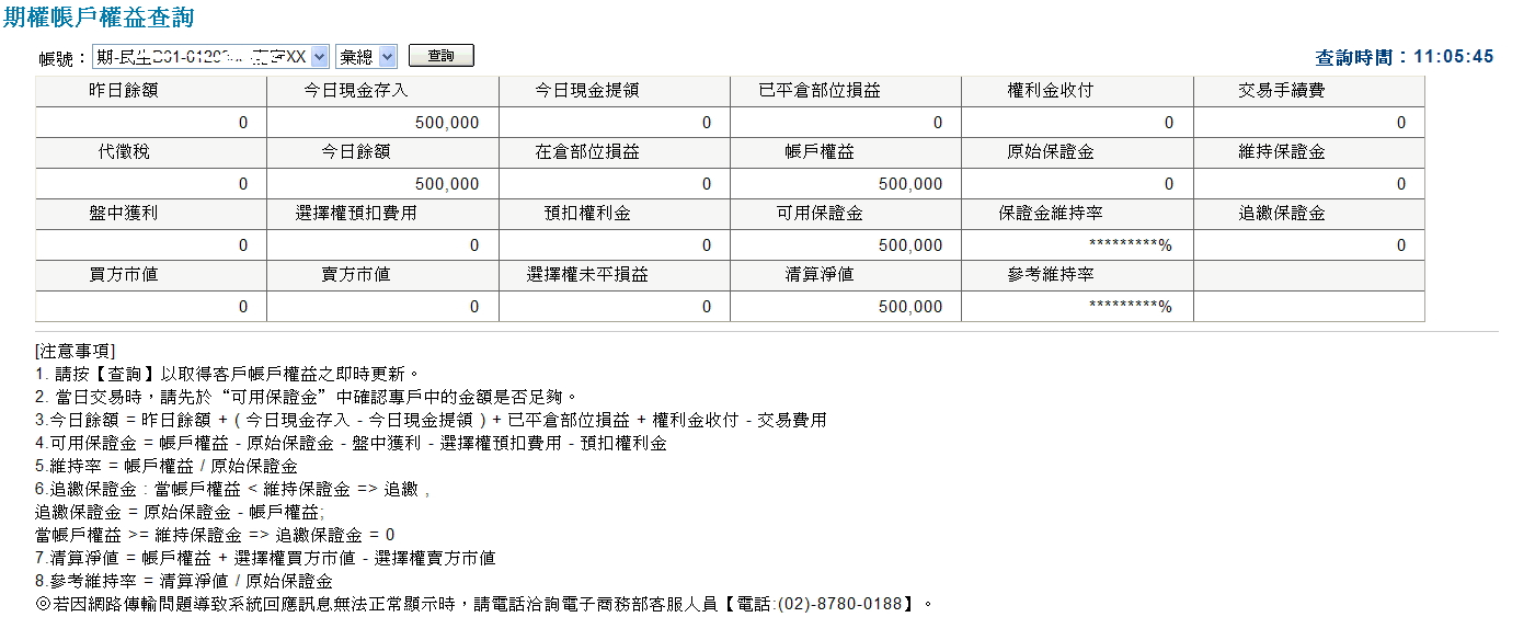 點選系統的〔期權帳務〕按鈕,再點選〔期權帳戶權益查詢〕標籤。