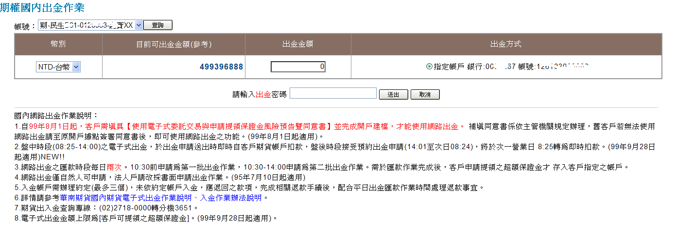 在出金欄位輸入出金金額,鍵入出金密碼後,可執行出金作業。