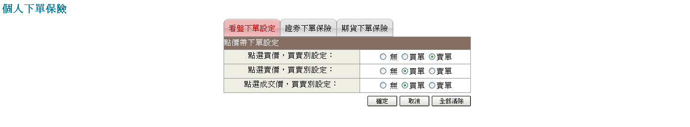 點選系統的〔個人設定〕按鈕,再點選〔下單保險〕標籤。