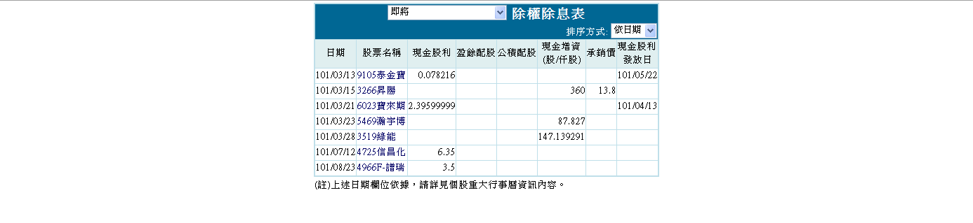 提供〔股市公告〕、〔法人進出明細〕、〔盤後交易〕、〔行情表〕、〔零股交易〕、〔營收總表〕、〔財務快報〕、〔大陸轉投資〕、〔DR行情表〕、〔權證行情表〕、〔權證總表〕等資訊。