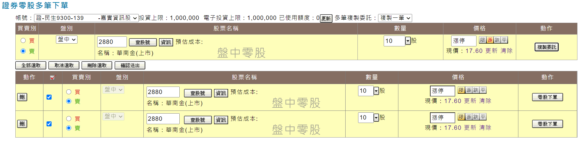 點選系統的〔零股交易〕按鈕,再點選〔多筆下單〕標籤。