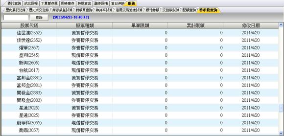 由交易頁面"群組按鈕"的「證券」點選「帳務」/「警示 股查詢」。
