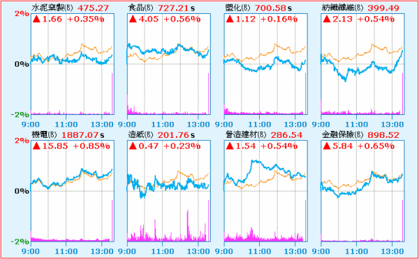 點選主功能列中「大盤」,接著選取「類股走勢」,再選取「上市8類比較圖」或「上市19類比較圖」或「上櫃類股比較圖」。