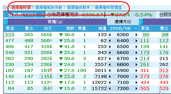 本功能頁提供四個相關子功能頁:選擇權報價、選擇權風險係數、選擇權波動率、選擇權時間價值。頁面操作類似,說明如下。