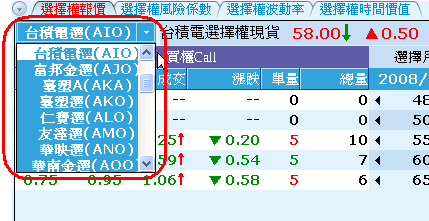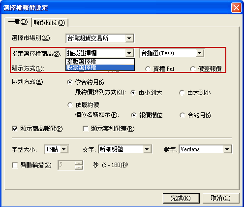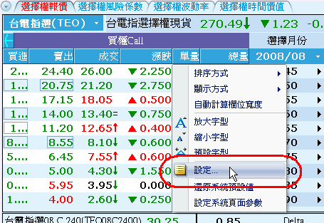 • 若要切換不同類型的,例如由指數選擇權換成個股選擇權,請在畫面中使用滑鼠右鍵選單,選擇"設定",進入後,切換指定的選擇權商品即可。