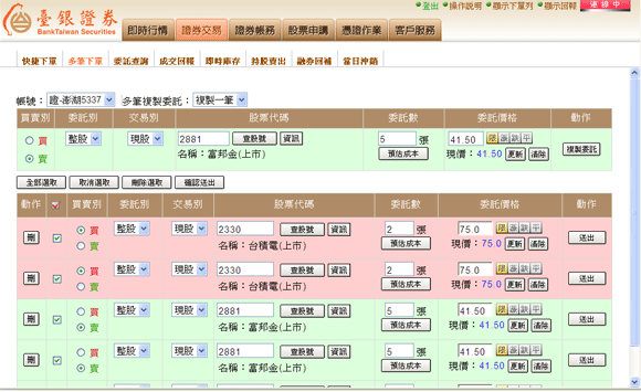 )按鈕,可將多筆下單的委託資料核取方塊已勾選的部份全部刪除。