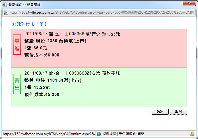)按鈕,可將多筆下單的委託資料核取方塊已勾選的委託資料「送出」,同時彈出 「交易確認」視窗如下圖,若按下〔取消〕鈕,則「取消」本筆委託。