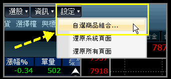 用戶可以從自選報價中的工具列來調整自選股清單,或是從主功能選單"設定"底下的"自選商品組合"項來做調整。