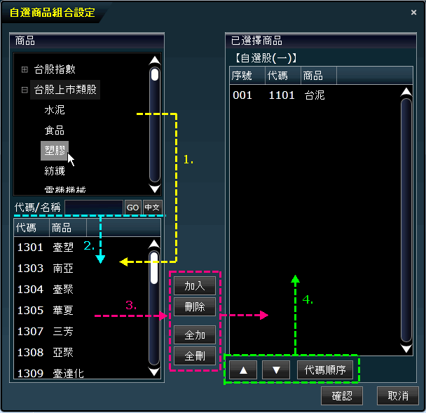 點擊[加入]Icon,會把搜尋結果區選定的個股,加進至右側的已選商品區域。點擊[全加]Icon,,會把搜尋結果區內的所有商品都加入至已選商品區域。