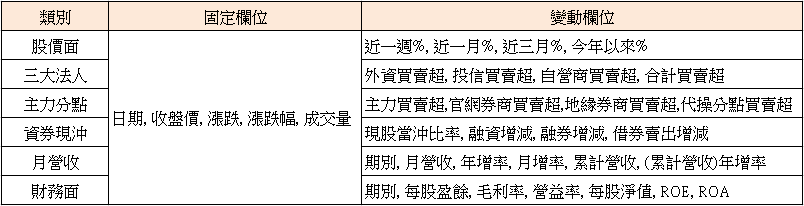 成份股分析欄位如下,"預設"依族群篩選條件而定。