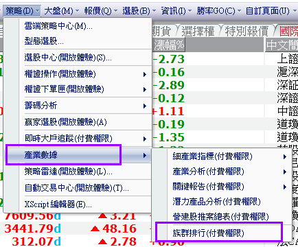 在族群系列功能中,「族群透視」著重分析盤中資金流向變化 ,什麼類股在走強,什麼類股走弱,可以觀察出市場最熱門的產業是那一些。 「族群排行」,則是透過籌碼、價量或財務等各面向的多樣條件,來檢視族群方方面面的表現。