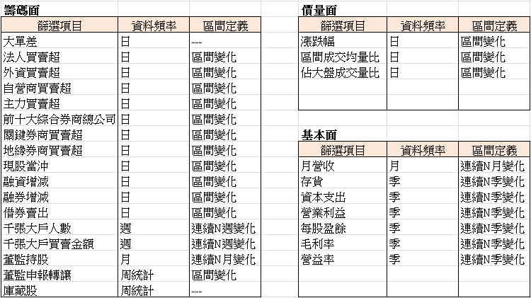 - 每個大分類都提供多個篩選條件。部份條件提供回溯功能。