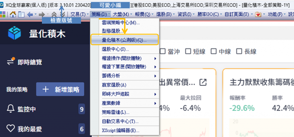 前面有提到我們在最新版本7.10.01/3.10.01內新增的量化積木,所以開啟XQ後請大家先檢查版號是不是7.10.01(企業版)3.10.01(個人版),這樣才能在策略menu底下找到量化積木(公測版)的相關資訊,若在策略內沒有看到的朋友們,請我們更版一下這樣才能看到喔!