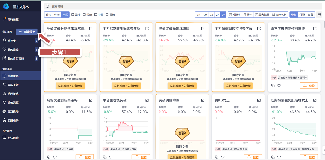 這個產品之所以取名為「量化積木」,要讓大家可以把需要的條件組起來變成策略,就好像拼樂高積木一樣,把積木組起來之後就是一個很厲害的模型,那到底要如何組成模型呢? 首先點選「新增策略」。