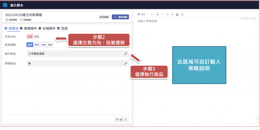 點選「新增策略」之後進來的畫面就會像這樣,可以選擇以下4項,其中交易方向與投資週期主要是設計讓大家在所有自訂策略中能夠快速篩選。- 交易方向:是多或空