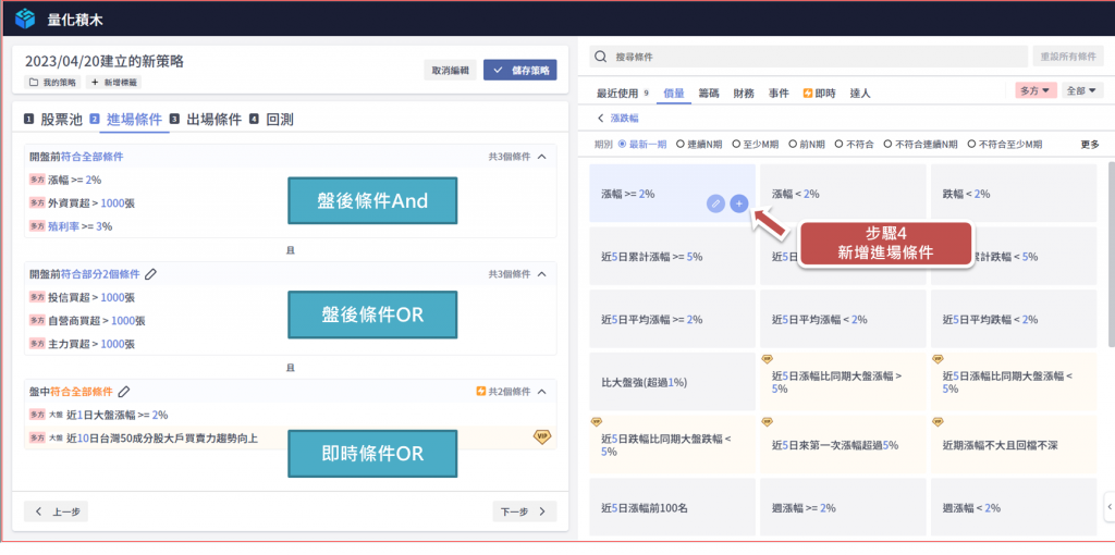 選擇完執行商品之後,開始選擇進場條件,這次量化積木的條件我們把盤後與盤中的條件組合在同一個策略內,以往盤後條件是在選股中心內篩選條件與撰寫XS腳本,盤中條件則是在自動交易或策略雷達來撰寫條件,量化積木不同之處就是將兩者整合再一起。