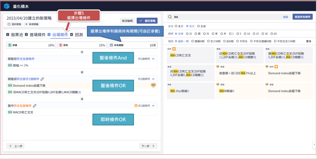 進場條件設定完之後,就可以來設定出場條件了,這邊除了停利損與持有期間可自訂參數之外,還可以選擇「出場條件」。