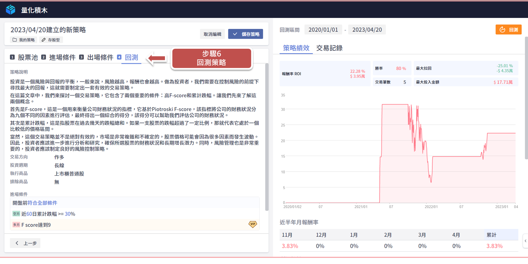 全部都設定完成之後,我們可以到回測底下進行回測,就可以看出這個策略跑出來的績效是如何。