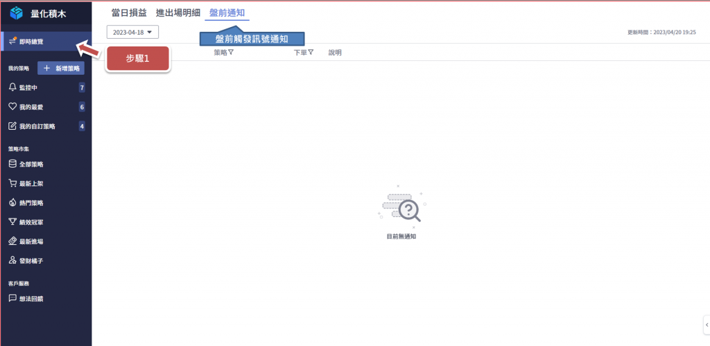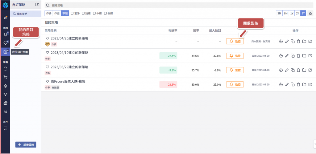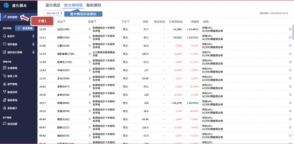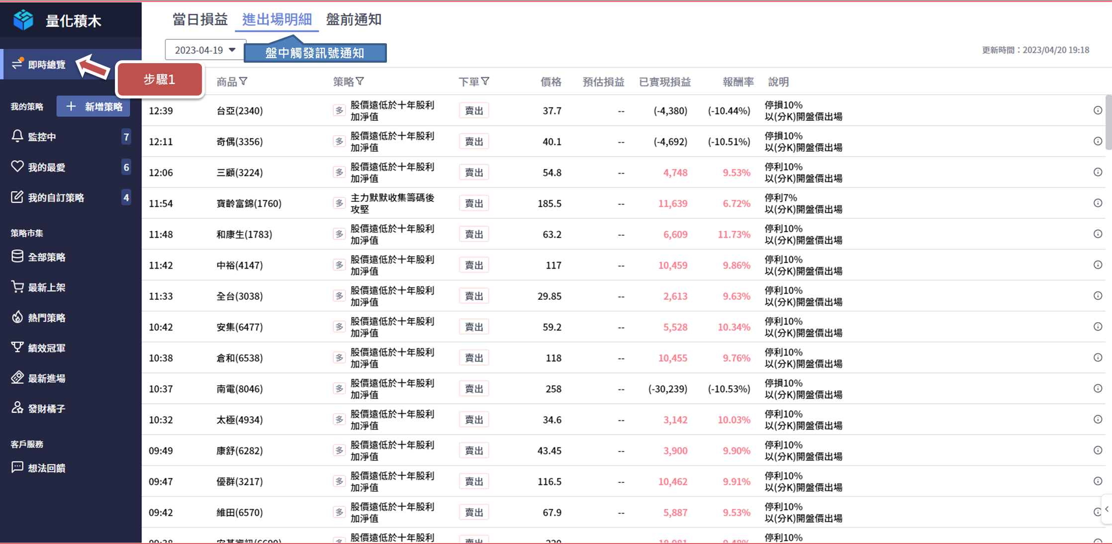 當我們已經自訂完自己的策略後,可以到「我的自訂策略」內看到所有的自訂策略,這時候就可以開啟監控,開啟監控後,若有觸發標的會在盤中或是盤前通知。 當要看盤中觸發訊號時,可以在即時總覽內的「進出場明細」來查看,如果策略只有盤後條件且有觸發時就會顯示在「盤前通知」。