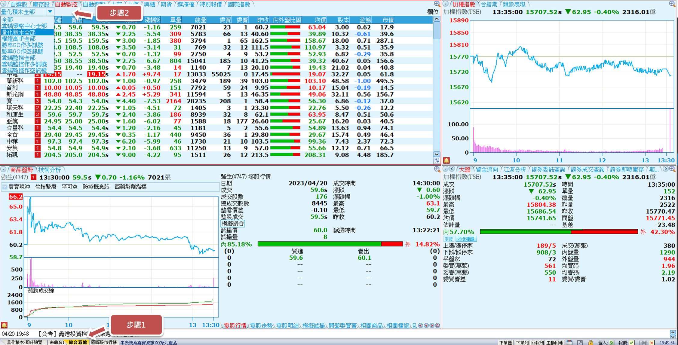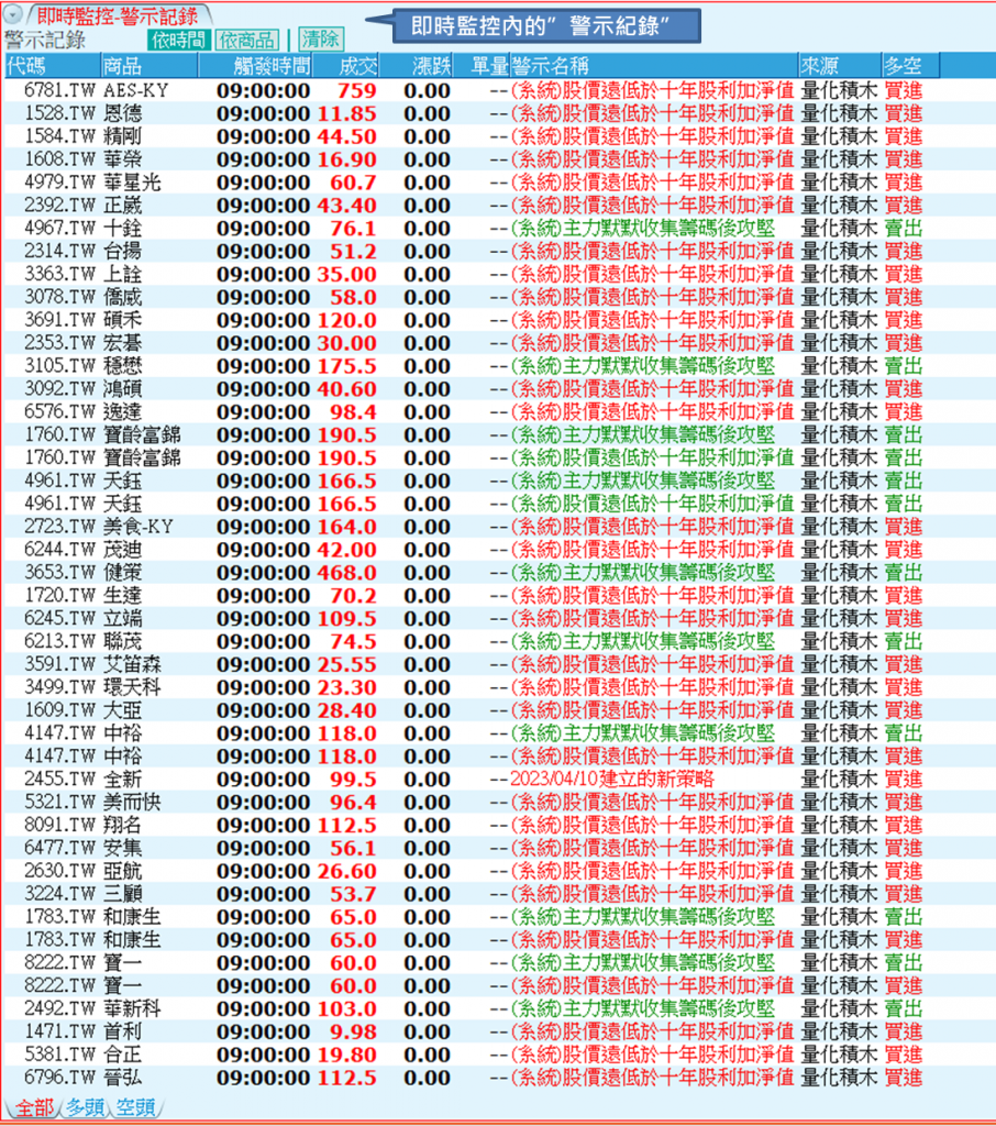 除了在量化積木本身可以看到觸發的標的以外,我們還可以在XQ本身的監控中查看。 共有兩個地方可以查看到。- 綜合看盤內的”自動監控”底下