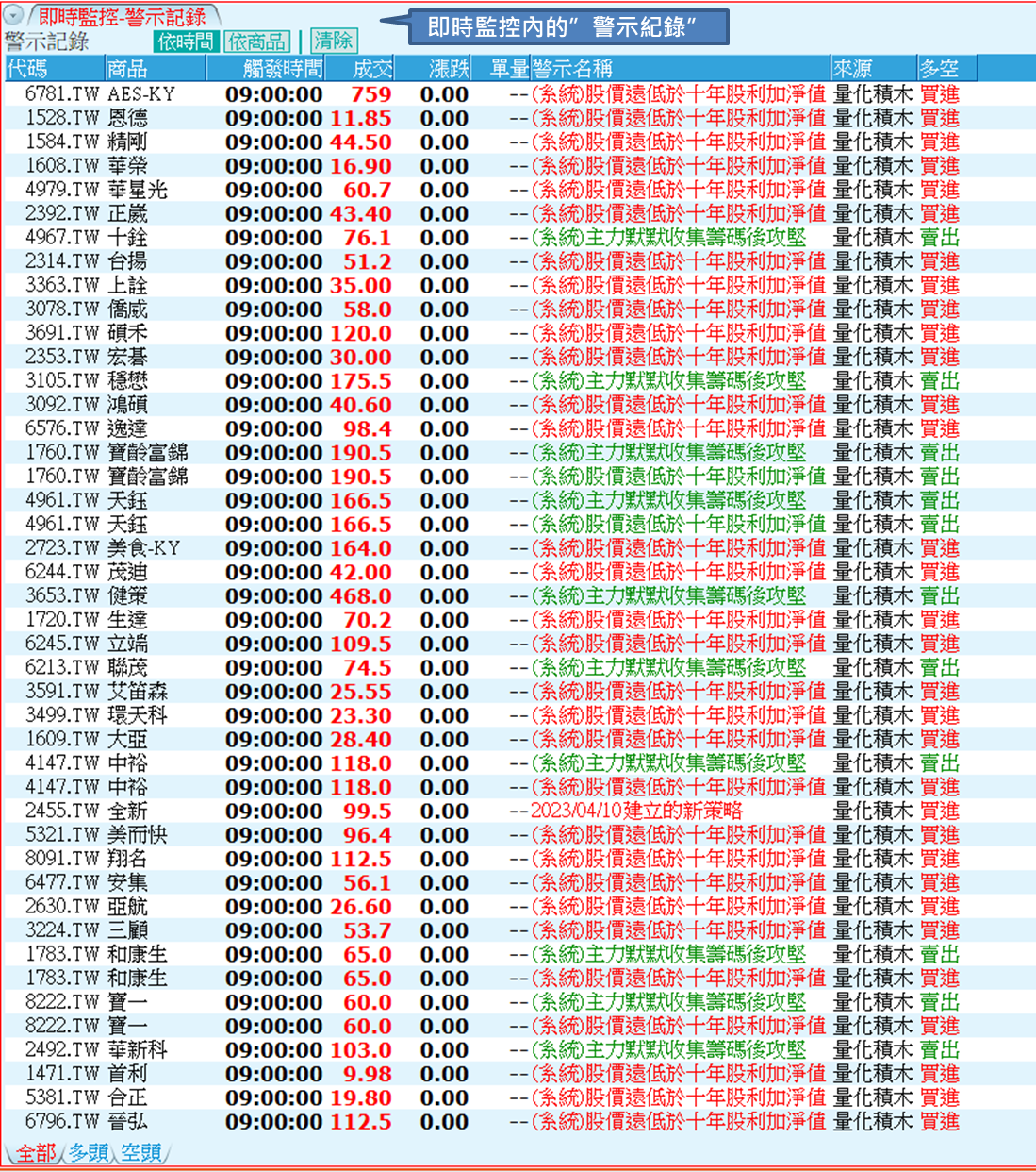 除了在量化積木本身可以看到觸發的標的以外,我們還可以在XQ本身的監控中查看。 共有兩個地方可以查看到。