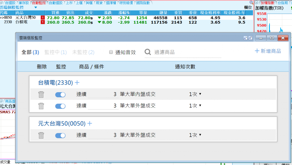 - 即時價量警示:利用雲端個股監控設定多種條件,在手機與桌機都可收到警示提示。