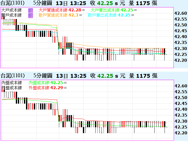 這些盤中分析買賣力道欄位與指標,是付費用戶才能查閱,對於盤中大單功能有興趣的用戶,請參考【台股即時行情】內容介紹。 本版增加了多個盤中分析買賣力道的指標,- 主圖指標: 大戶成本線 內盤成本線 外盤成本線 散戶成本線