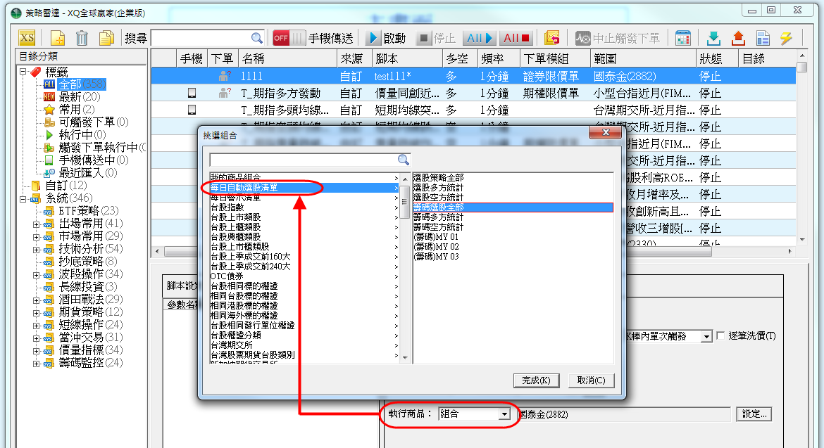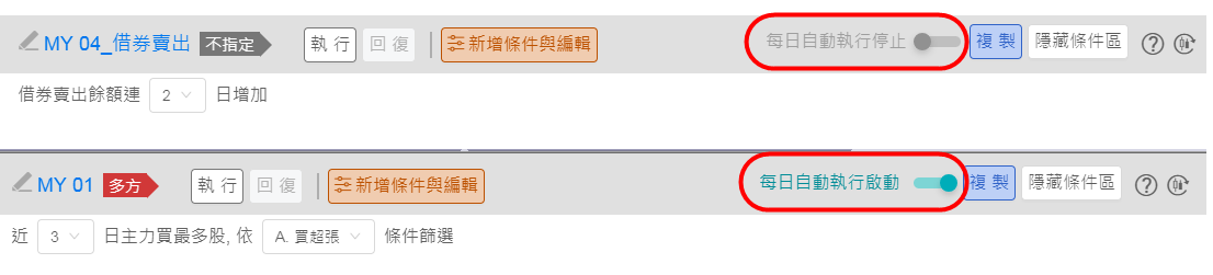 - 「每日自動執行」可以查看全部或是依多空方看統計,並列出設定為每日自動執行的選股組合名稱。