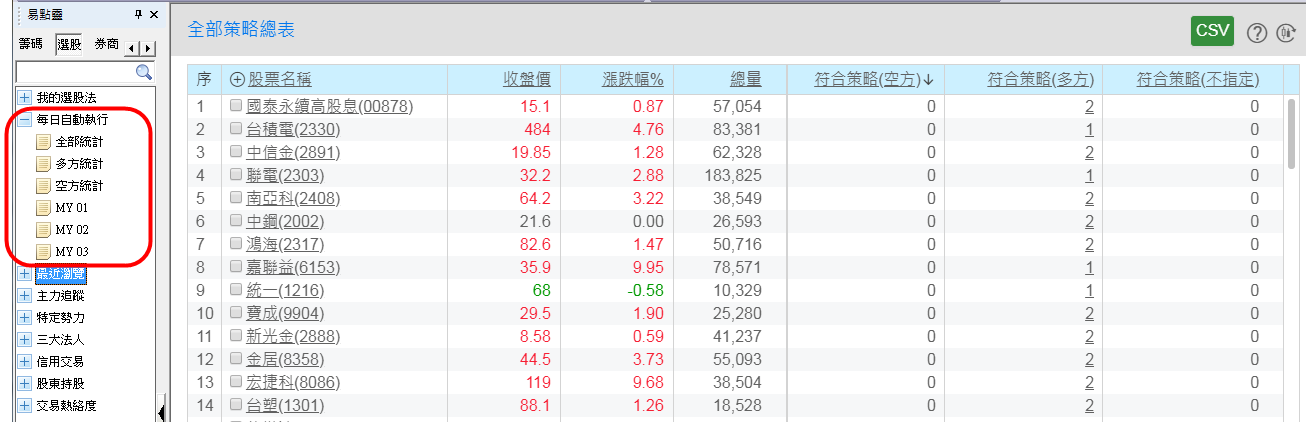 2, 左側功能中「每日自動執行」,可以查看整體分析,表格會列出入選個股有符合的條件組數。