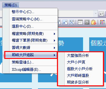 對於籌碼大數據功能有興趣的用戶,請參考我們【籌碼大數據】這整區的介紹。二,在「策略」主功能下新增「即時大戶追蹤」項目,提供盤中買賣力相關的功能頁面。