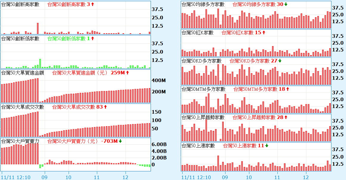 - 市場動能: 台灣50創新高家數 台灣50創新低家數 台灣50上漲家數 台灣50大單成交次數 台灣50大戶買賣力 台灣50大單買進金額 台灣50KD多方家數 台灣50MTM多方家數 台灣50紅K家數 台灣50上昇趨勢家數 台灣50均線多方家數