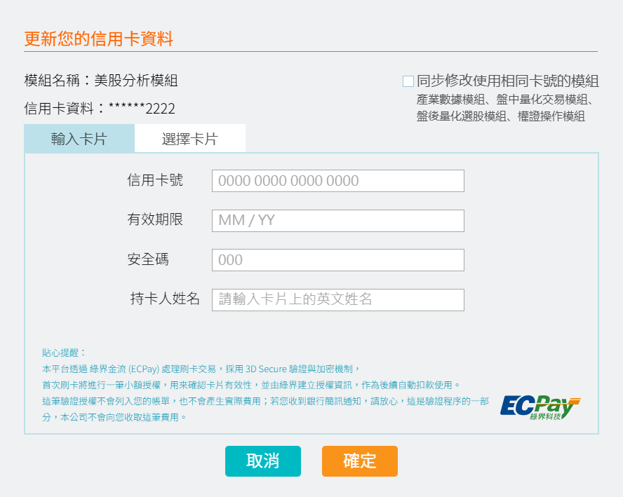 由主選單進入「設定→我的權限」頁面,在訂閱項目中,會顯示已購買的模組,模組下方有「變更信用卡」,於「更新您的信用卡」介面中,可以選擇是否同步修改其他使用相同卡號購買的模組,不需要重複更換各模組的信用卡。
