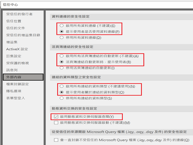 - EXCEL 信任中心設定: 「檔案」>「選項」>「信任中心」>「信任中心設定」>「外部內容」,啟用下圖所有紅圈處相關設定。