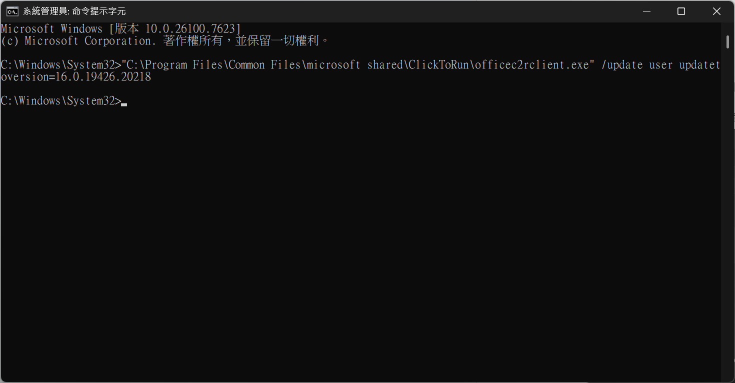 “C:\Program Files\Common Files\microsoft shared\ClickToRun\officec2rclient.exe” /update user updatetoversion=16.0.19426.20218