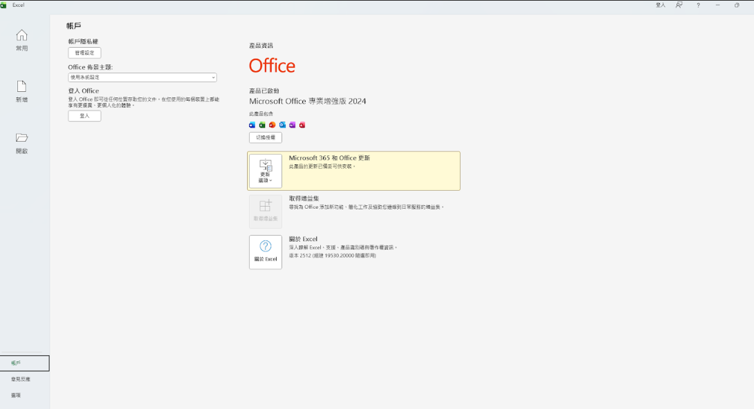 1.請由 EXCEL > 檔案 > 帳戶 > 關於 EXCEL,確認戶版本為 2512 或 2601