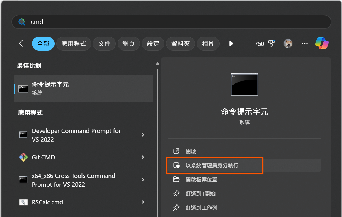 搜尋 “cmd”,以 系統管理員 身分執行「命令提示字元」