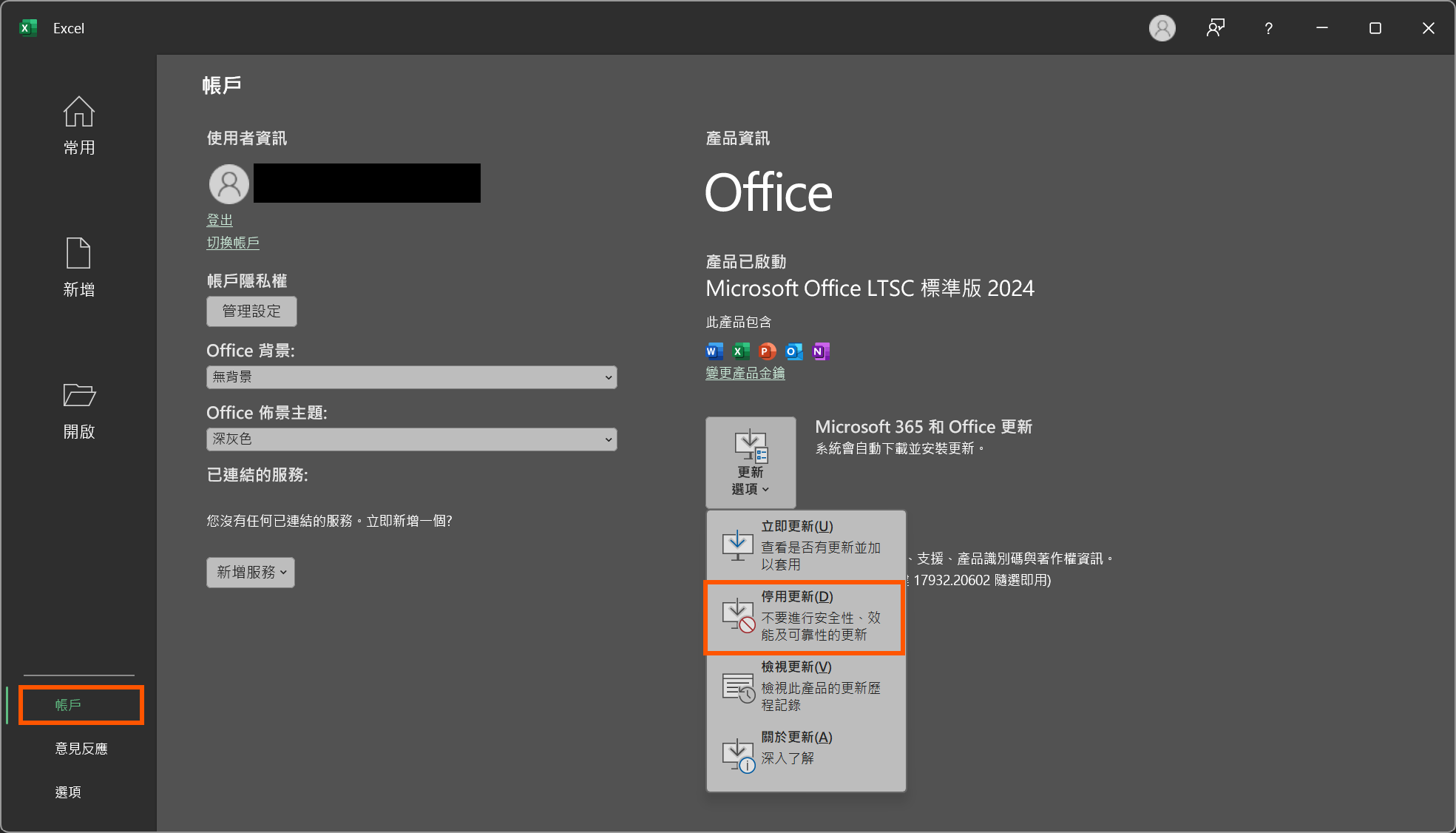 確認 EXCEL 版本是否降版為 2511,並請停用 office 更新