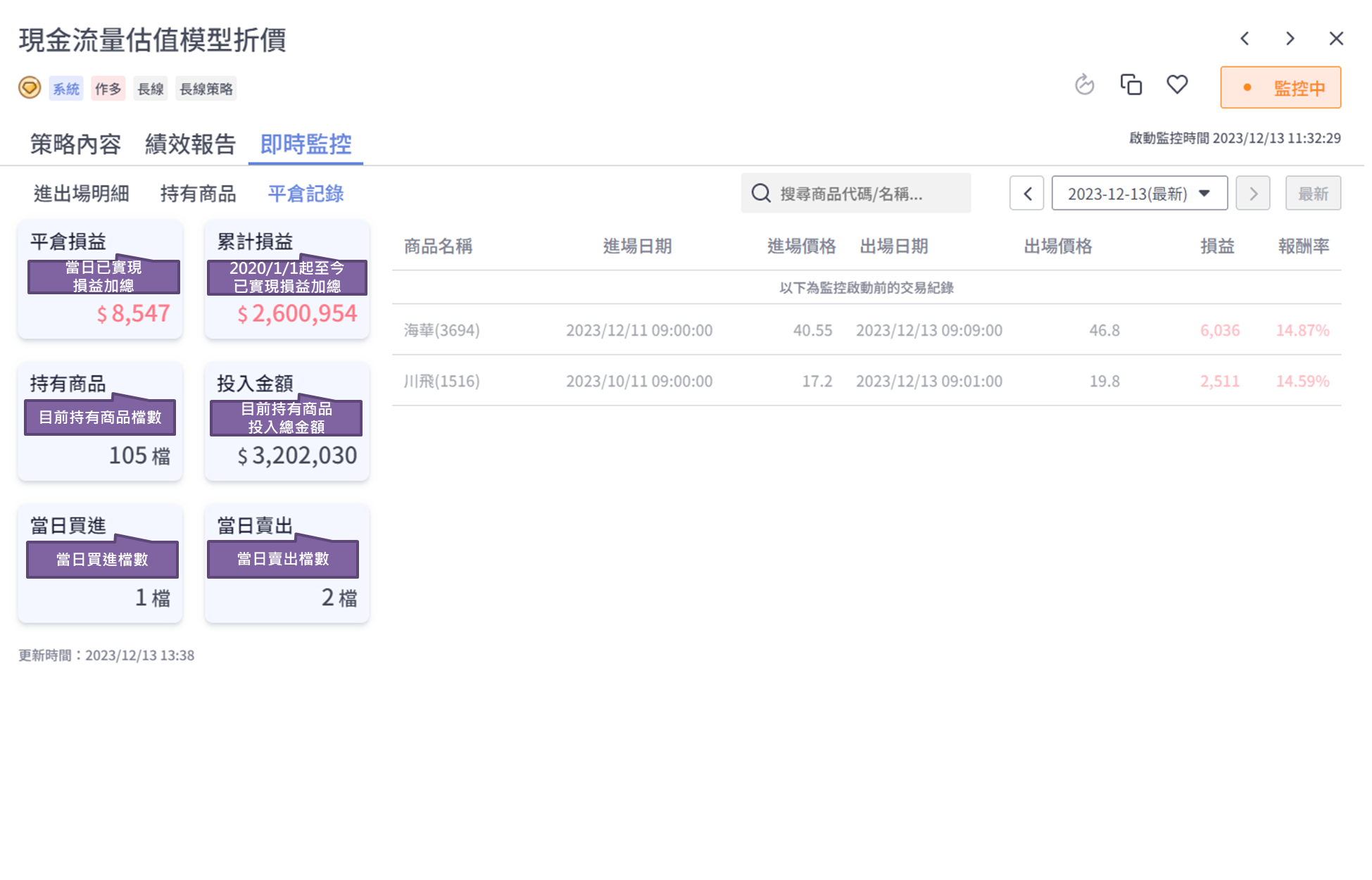 開啟監控之後,會看到有三個分頁,分別是「進出場明細」、「持有商品」和「平倉紀錄」。接下來,我會逐一介紹這三個分頁的內容,讓你更清楚每個分頁的用途和如何幫助你更好管理策略。